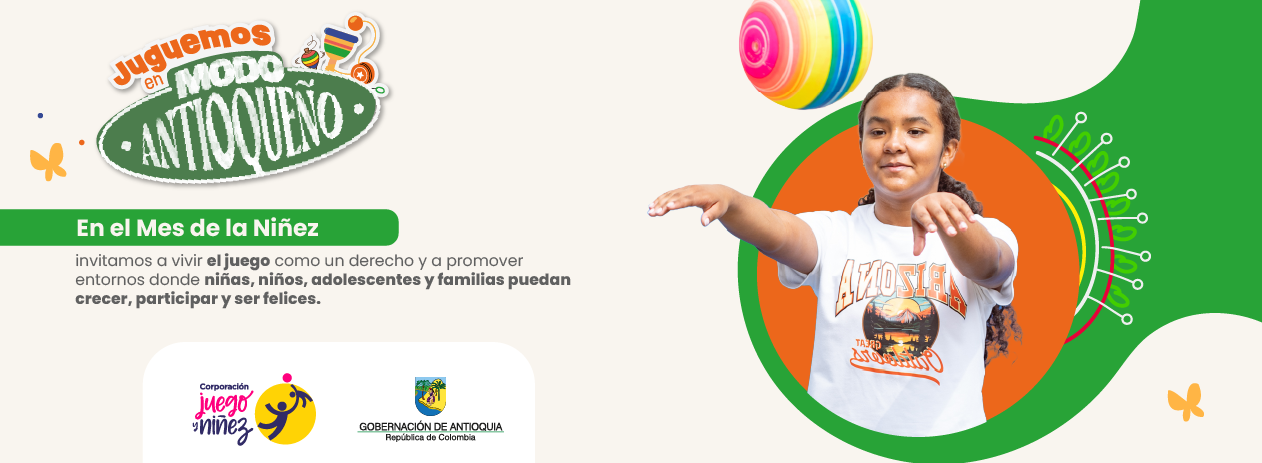Durante este Mes de la Niñez, en Antioquia reafirmamos que las niñas, niños y adolescentes están en el centro de nuestras acciones. Es por esto que con una amplia movilización social, enmarcada en los Festivales del Juego por la Niñez, el departamento celebrará con más de actividades lúdico-pedagógicas, acompañadas de alegría, diversión y que juntos juguemos en Modo Antioqueño.