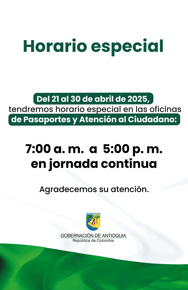 La Gobernación de Antioquia informa a la ciudadanía sobre los cambios en los horarios para la prestación de servicios durante la Semana Santa. La Dirección de Pasaportes y el Centro de Liquidaciones del Impuesto Vehicular, ubicado en el sótano externo, atenderán al público de manera normal del lunes 14 al miércoles 16 de abril, mientras que en las demás dependencias del Centro Administrativo Departamental (CAD) suspenderán temporalmente la atención presencial en esas mismas fechas.
