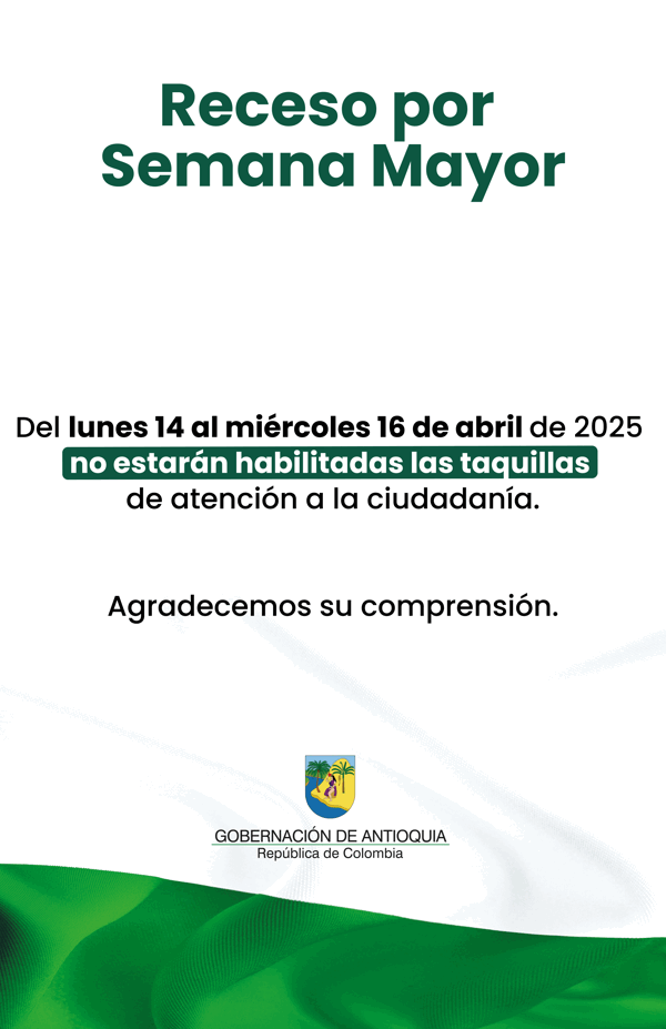 La Secretaría de Talento Humano y Servicios Administrativos recomienda a los ciudadanos programar con anticipación sus visitas a las dependencias de la Gobernación de Antioquia, teniendo en cuenta estas modificaciones temporales en la operación habitual.