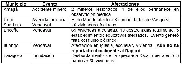 En marzo, mes de transición hacia la temporada de lluvias, se presentaron eventos en Amagá, Urrao, San Luis, Valdivia, Briceño, Ituango y Zaragoza.