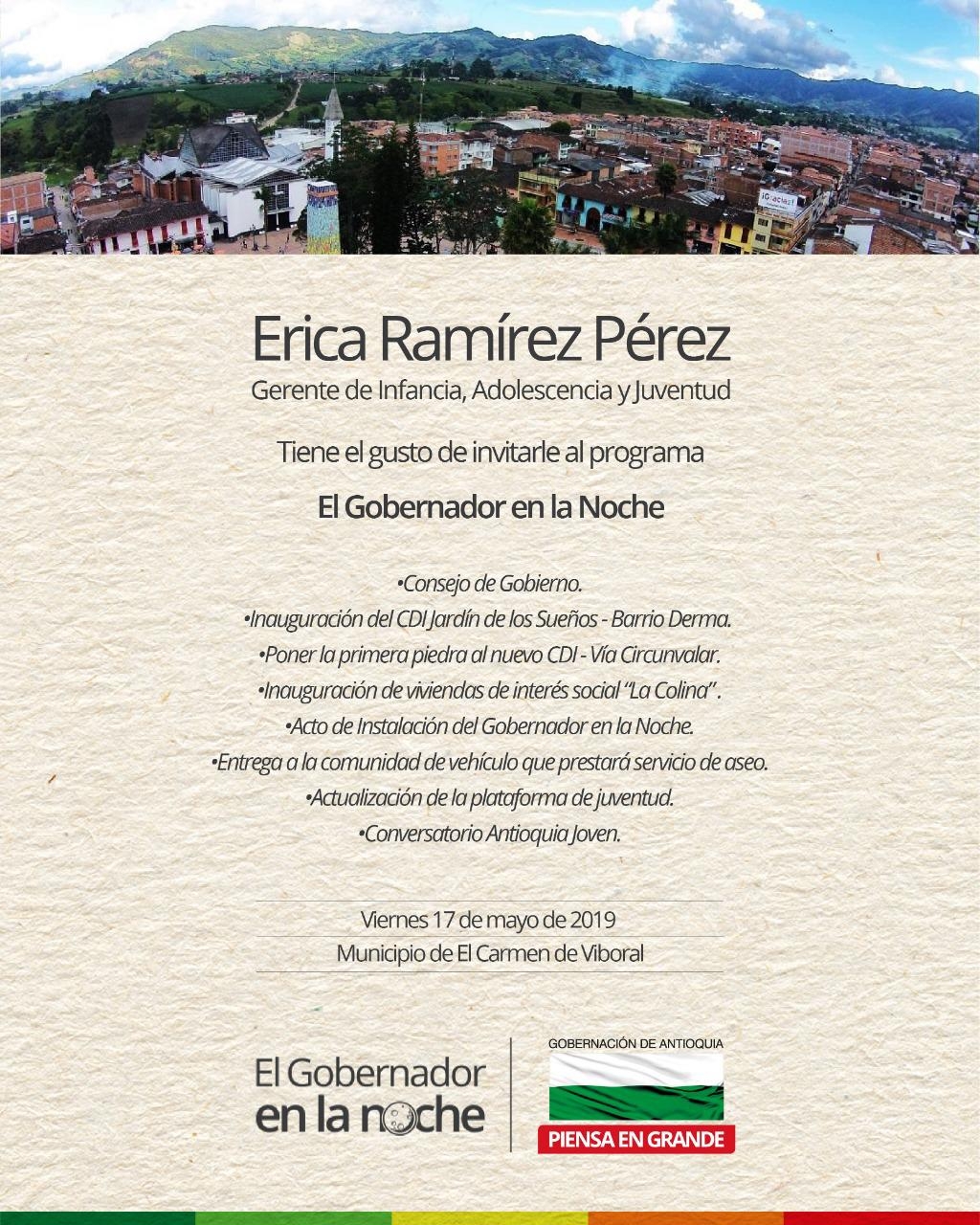 Este viernes 17 de mayo al municipio de El Carmen de Viboral llegará el equipo de la Gerencia de Infancia, Adolescencia y Juventud en cabeza de Érica Ramírez Pérez, desarrollando la política pública de El Gobernador en la Noche.