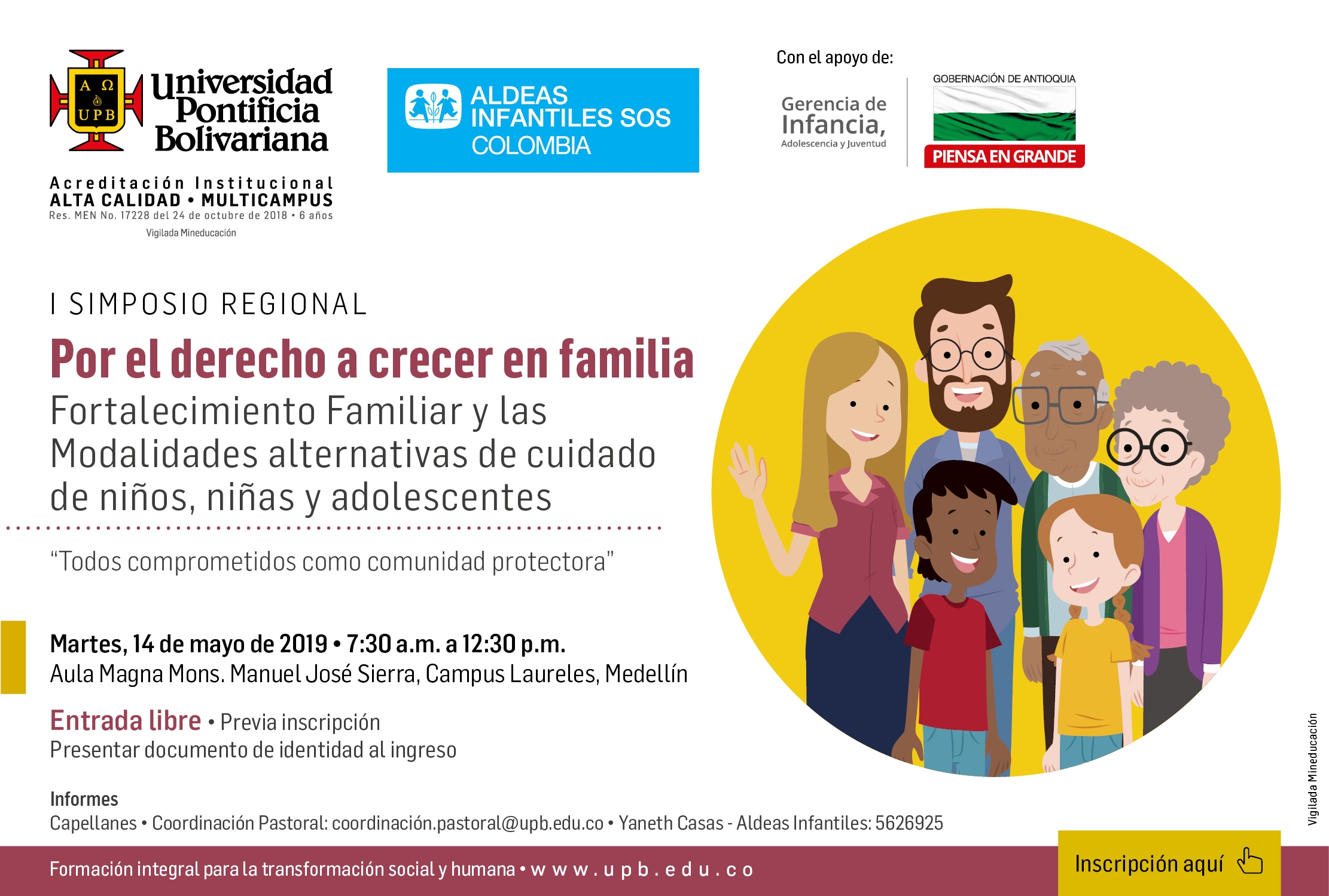 El Primer Simposio Regional Por el Derecho a Crecer en Familia se llevará a cabo mañana martes 14 de mayo de 7:30 a.m. a 12:30 p.m. en el Aula Magna de la Universidad Pontificia Bolivariana. El ingreso es gratuito con previa inscripción, los cupos son limitados.