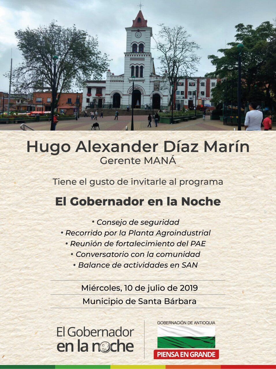 Este miércoles 10 de julio llegará al municipio de Santa Bárbara Hugo Alexander Díaz Marín gerente de Seguridad Alimentaria y Nutricional – MANÁ, con la política pública de El Gobernador en la Noche. El objetivo de esta jornada de trabajo es fortalecer el Programa de Alimentación Escolar – PAE y tener un acercamiento con la comunidad santabarbareña.