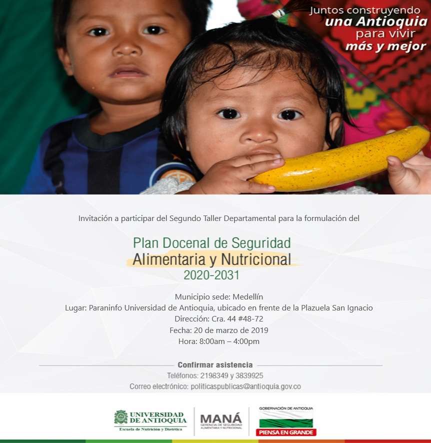 En la formulación del Plan Docenal de Seguridad Alimentaria y Nutricional para Antioquia-PDSAN 2020-2031, extendemos esta invitación con el fin de recibir sus aportes desde la visión general de la SAN y como se desarrolla ésta en los distintos programas implementados en todos los municipios del departamento.