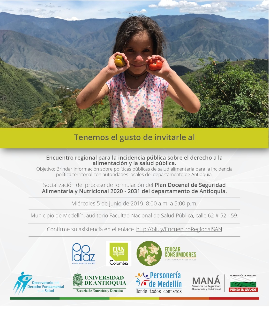 La Gerencia de Seguridad Alimentaria y Nutricional – MANÁ de La Gobernación de Antioquia, La Escuela de Nutrición y Dietética de la Universidad de Antioquia y demás entidades organizadoras, lo invitan a participar en el “Foro regional para la incidencia pública sobre el derecho a la alimentación" el cual tiene como objetivo informar acerca de las políticas públicas de salud alimentaria para la incidencia política territorial con autoridades locales del departamento de Antioquia.