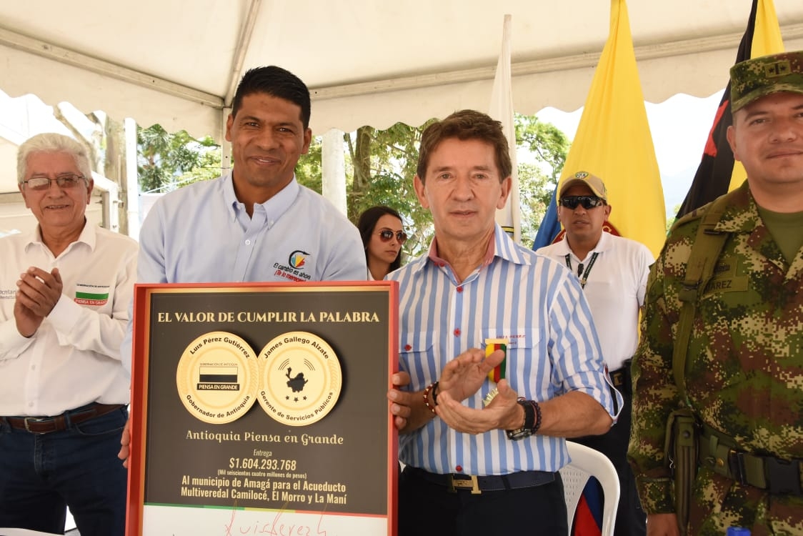 En la mañana de hoy, el gobernador Luis Pérez Gutiérrez acompañó a la comunidad amagaseña en la celebración de sus 231 años de vida municipal. Durante el acto conmemorativo el Mandatario Seccional y el gerente de servicios públicos de la Gobernación entregaron al alcalde Wilser Darío Molina, la suma de 1.604 millones de pesos para la construcción de acueducto multiveredal Camilocé, El Morro y La Maní.