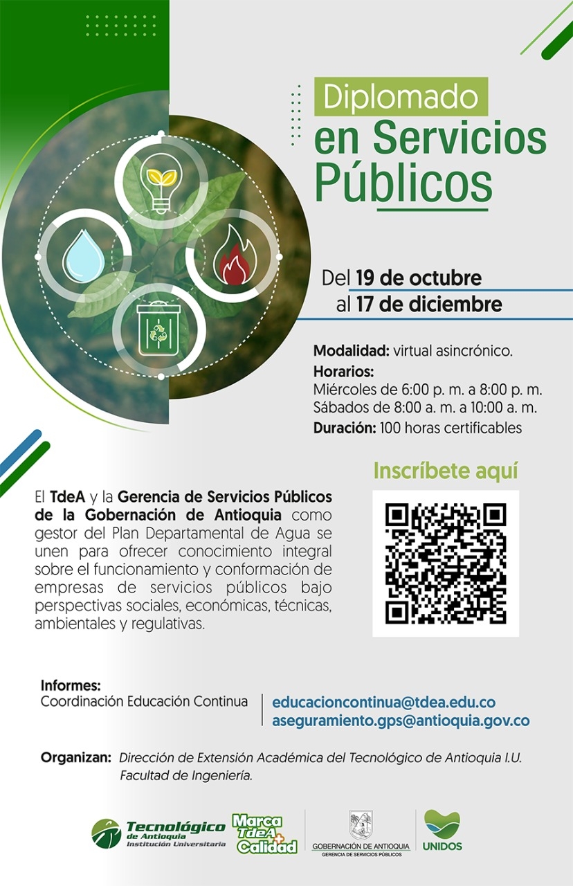 La Gerencia de Servicios Públicos abre inscripciones para el diplomado en Servicios Públicos que ofrecerá con el aval académico del Tecnológico de Antioquia, que tiene como propósito ofrecer conocimientos sobre el funcionamiento y conformación de empresas de servicios públicos bajo perspectivas sociales, económicas, técnicas, ambientales y de regulación.