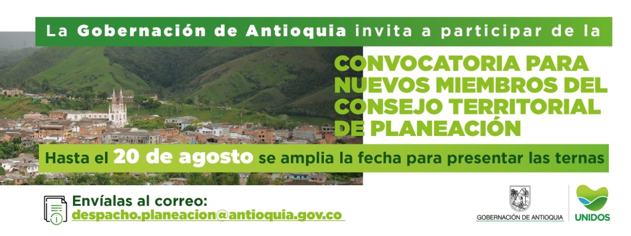 La Gobernación de Antioquia, a través del Departamento Administrativo de Planeación abre convocatoria para que las organizaciones de los sectores de la sociedad, libertad religiosa y de culto, educativo, asociaciones de campesinos, juventudes, LGBTIQ+ y personas con discapacidad, postulen a sus representantes ante el Consejo Territorial de Planeación.