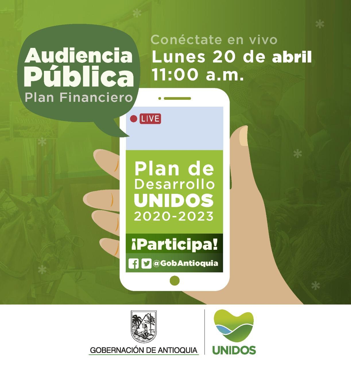 Con el objetivo de promover la participación ciudadana en la gestión pública, la transparencia en la construcción del Plan de Desarrollo Departamental y en cumplimiento del artículo 22 de la Ley 1909 de 2018, el Departamento Administrativo de Planeación en cabeza de su directora Claudia García Loboguerrero, y la secretaria de Hacienda Luz Elena Gaviria, realizarán una audiencia pública para la socialización del Plan Plurianual de Inversiones, a través de las plataformas sociales de Facebook y Twitter de la Gobernación de Antioquia el próximo lunes 20 de abril de 2020 a las 11:00 a.m.