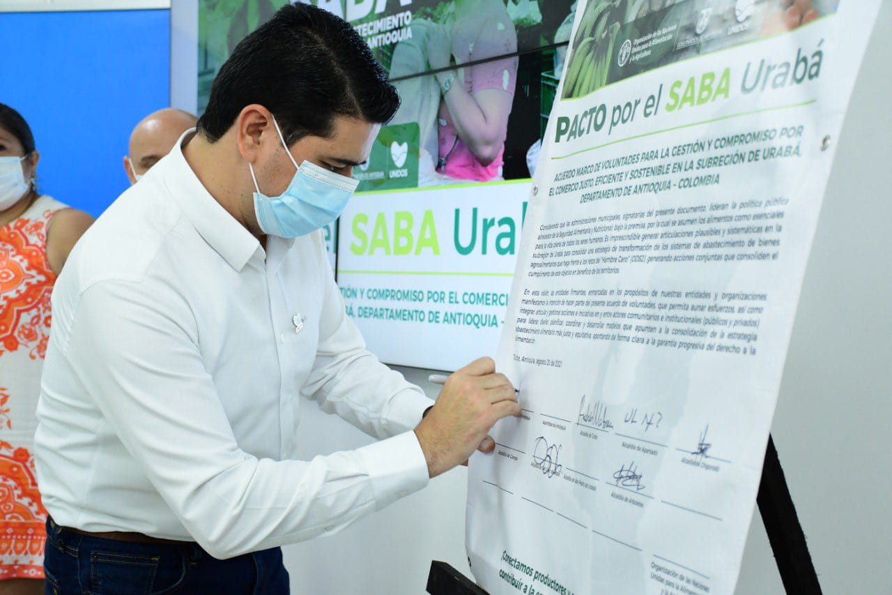 Igualmente, siete alcaldes de la zona realizaron la firma protocolaria del “Pacto por el SABA Antioquia” con el objetivo generar compromisos públicos por parte de las alcaldías para empezar a trabajar en la incidencia de la política pública y aportar recursos técnicos, financieros y económicos para mejorar los sistemas de abastecimiento alimentarios en la subregión, en aras de un comercio justo, eficiente, sostenible e inclusivo.