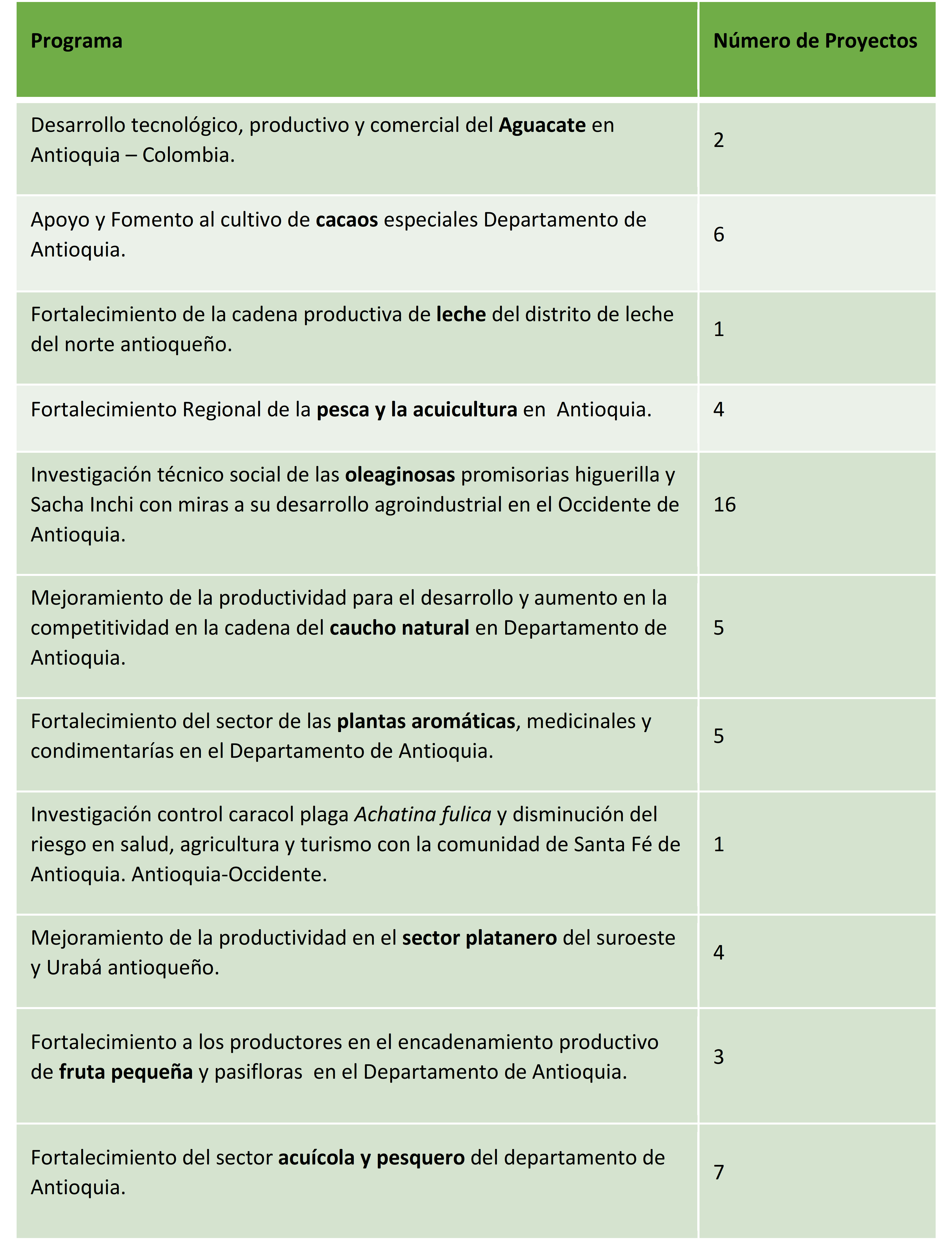 Con los recursos del Sistema General de Regalías – SGR- del Fondo de Ciencia Tecnología e Innovación (FCTeI), recursos propios del Departamento y recursos del sector privado, entre otros en las vigencias 2012 - 2015; el Departamento de Antioquia financió y apoyó la ejecución de 56 proyectos de investigación que atendieron demandas de 12 programas estratégicos de cadenas productivas priorizadas para Antioquia, dichos proyectos fueron ejecutados tanto en Investigación Básica como aplicada (Tabla 1).