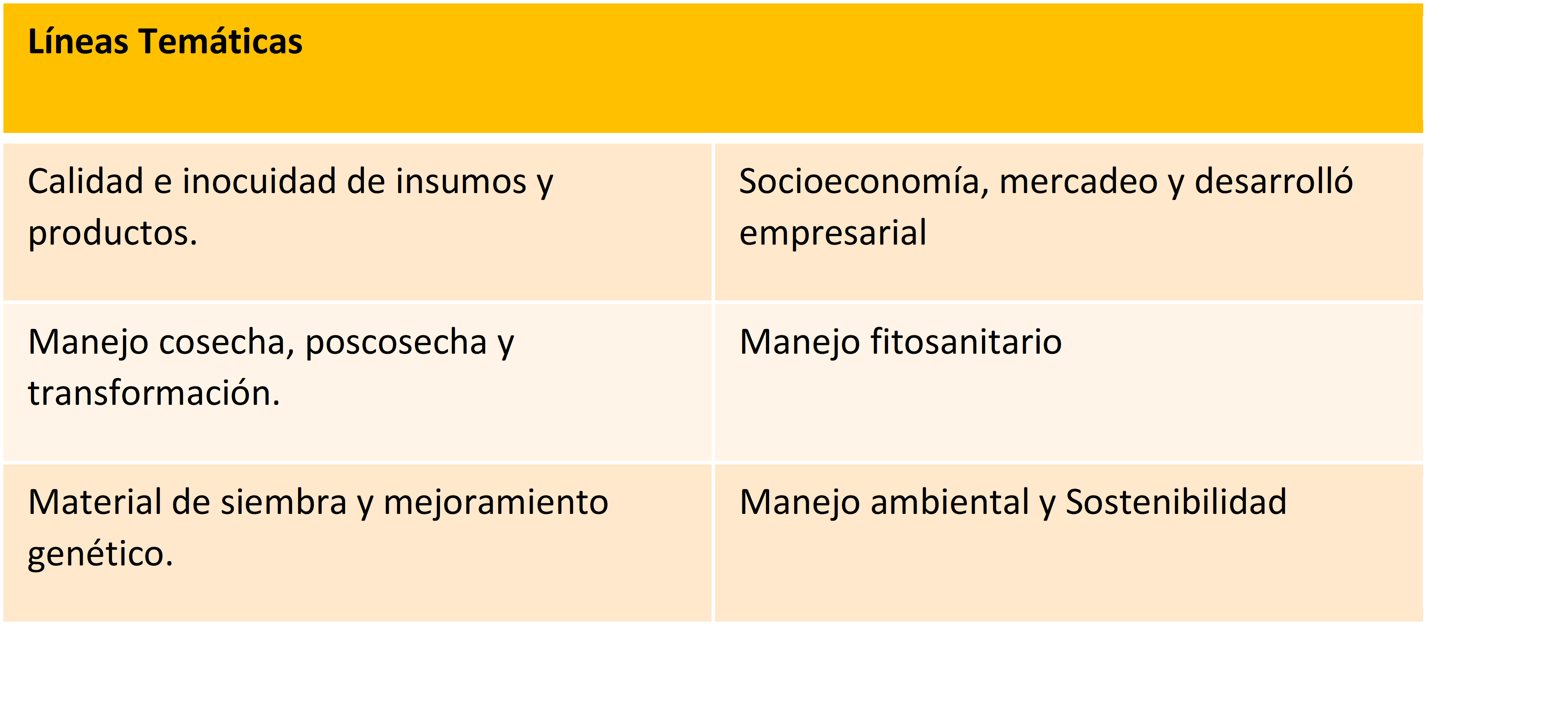 Adicionalmente, los proyectos deberán corresponder a las líneas temáticas presentadas en la siguiente tabla. Estas líneas temáticas fueron identificadas y concertadas con los Consejos de Cadena respectivos en el marco del Plan Estratégico de Ciencia, Tecnología e Innovación para el sector Agropecuario Colombiano, PECTIA.
