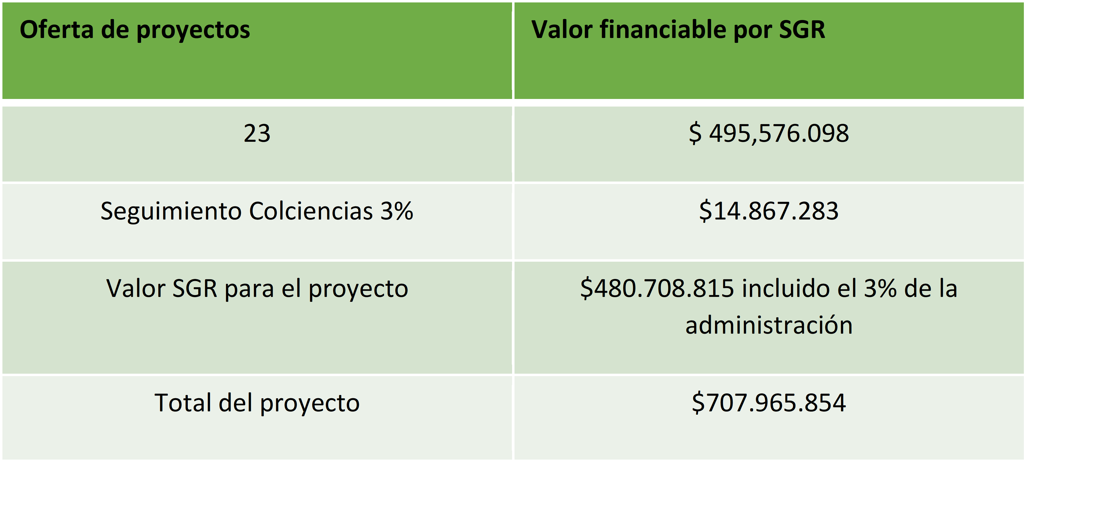La Gobernación de Antioquia a través de Colciencias aportará el 70% y exigirá mínimo un 30% de contrapartida, en especie o en efectivo, lo que implica que el valor total mínimo de los proyectos financiados será de $707.965.854.