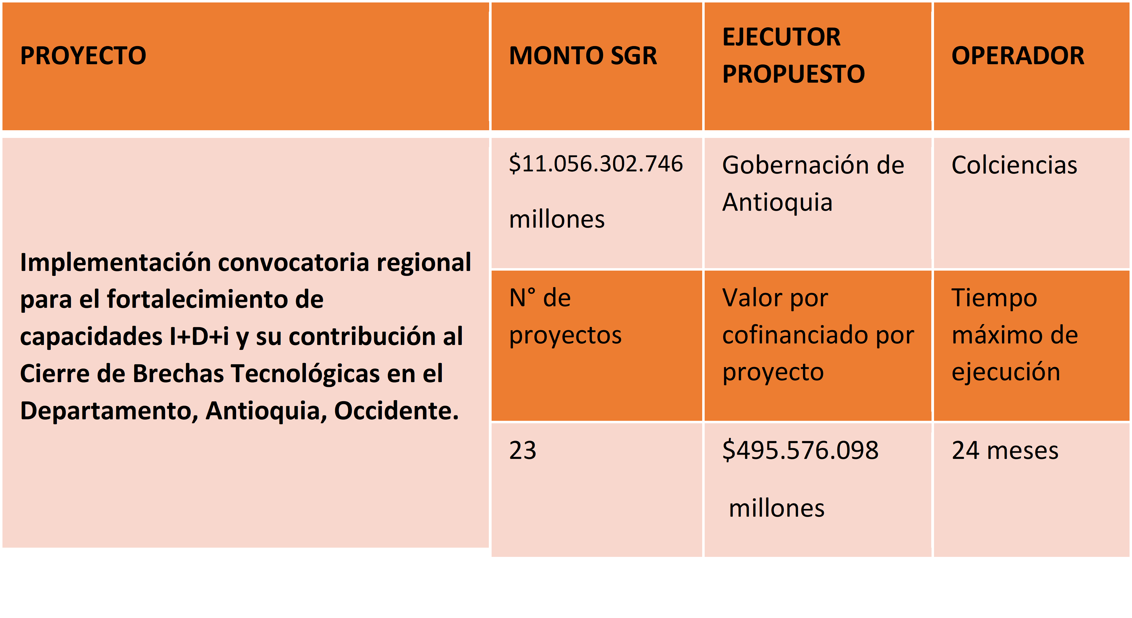 Implementación convocatoria regional para el fortalecimiento de capacidades I+D+i y su contribución al Cierre de Brechas Tecnológicas en el Departamento, Antioquia, Occidente