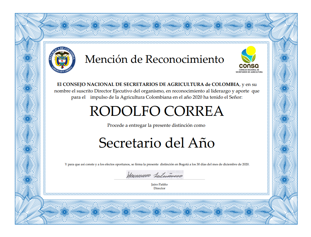 El Consejo Nacional de Secretarios de Agricultura de Colombia – CONSA, otorgó al Secretario de Agricultura de Antioquia, Rodolfo Correa, la distinción como Secretario del año.