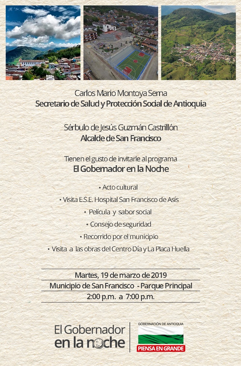 Al municipio de San Francisco llegará este 19 de marzo de 2019 la política Pública de El Gobernador en la Noche, dirigido es esta ocasión por el Secretario de Salud y Protección Social de Antioquia, Carlos Mario Montoya Serna, quien estará desde las 2:00 de la tarde compartiendo con todos los sanfrancisquenses.