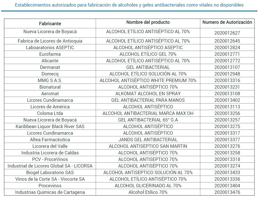 Adicionalmente, el Invima como ente de vigilancia y control dispuso en su página web el siguiente enlace https://www.invima.gov.co/autorizaciones-de-fabricacion-e-importacion-para-vitales-no-disponibles en el que se publican los establecimientos autorizados para la fabricación y comercialización de productos desinfectantes. A su vez, la resolución 520 de 2020 del Ministerio de Salud y Protección Social establece los requisitos para la fabricación de antisépticos y desinfectantes para el uso de la emergencia sanitaria declarada por COVID-19.