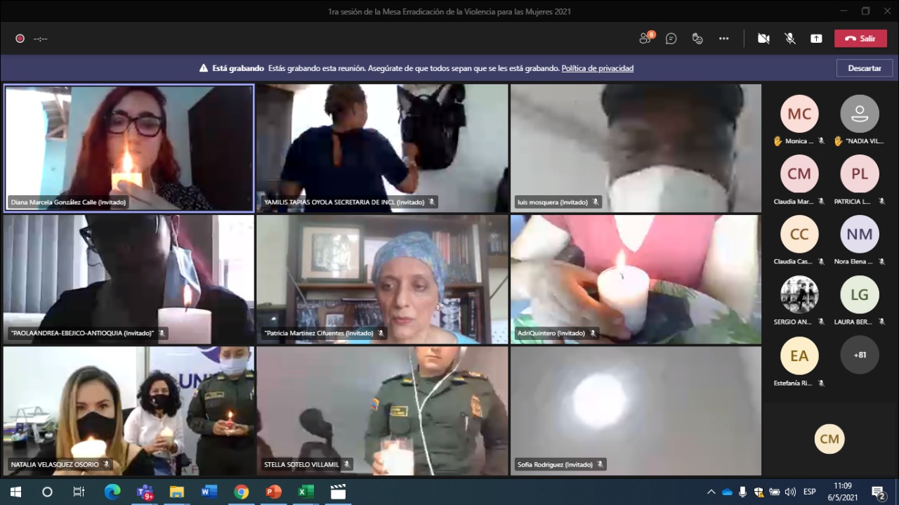 Al finalizar, hubo un minuto de silencio y solidaridad con las víctimas de feminicidio y las mujeres asesinadas en Antioquia. A su vez, desde este despacho y desde el rol de secretaría técnica del espacio, se agradeció la participación y el compromiso de los participantes en esta Mesa Departamental de Erradicación de Violencia contra las mujeres, y se instó a todos los presentes para que, desde sus instituciones y a través de la Mesa, se trabaje decididamente en la promoción y la garantía del derecho de las mujeres a vivir libres de violencias.