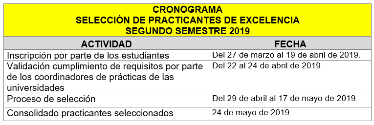 A continuación, le relacionamos el cronograma para la selección de los Practicantes de Excelencia para el segundo semestre de 2019: