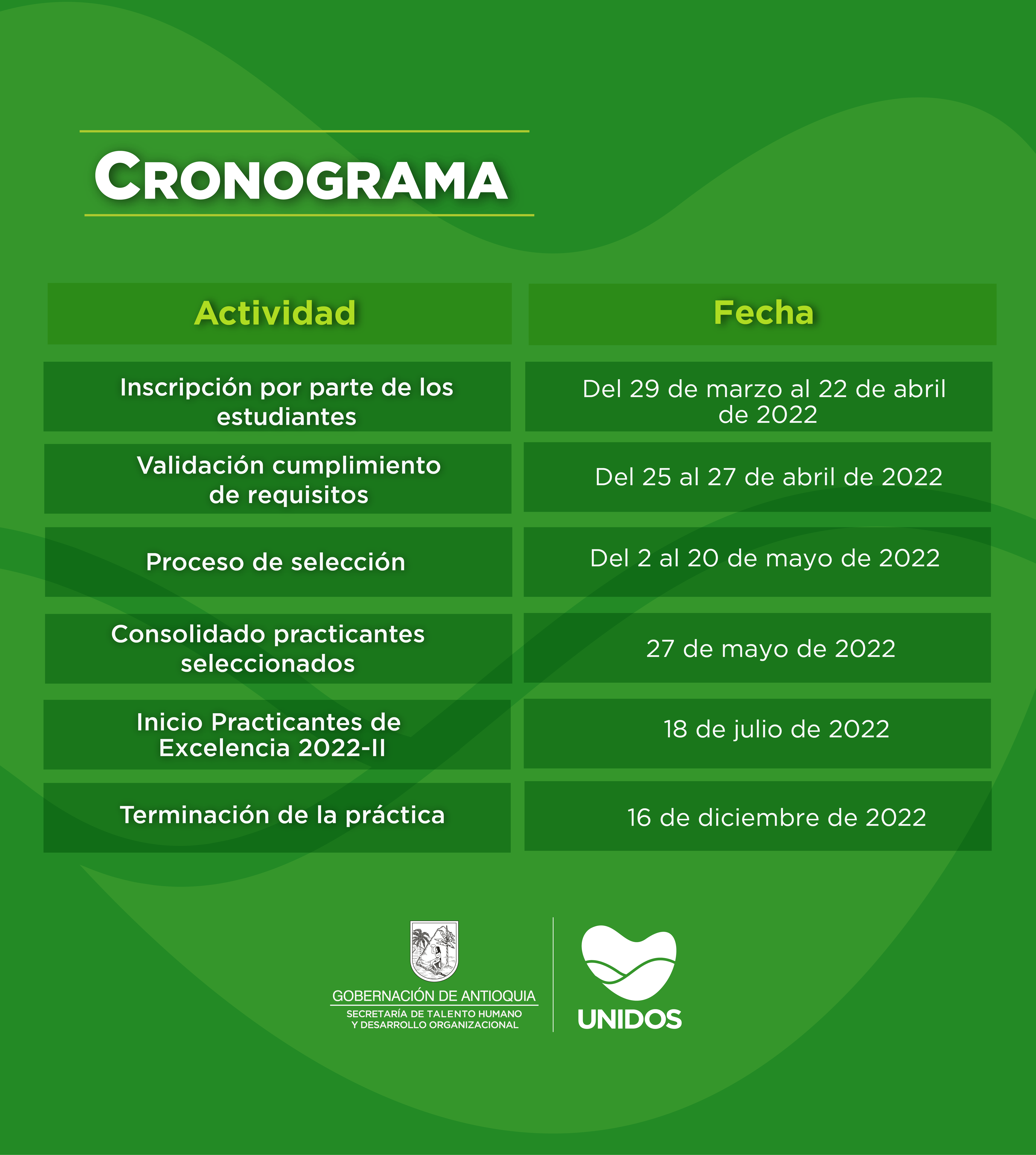 Antioquia UNIDOS, invita a las instituciones de educación pública y privada de nuestro departamento, para que hagan parte de esta convocatoria. Buscamos estudiantes comprometidos, interesados en el sector público que aporten y generen valor agregado a la Gobernación, y que estén dispuestos a poner sus conocimientos al servicio de la comunidad, que se destaquen por su excelencia académica, por su habilidad para proponer, liderar, crear e innovar.