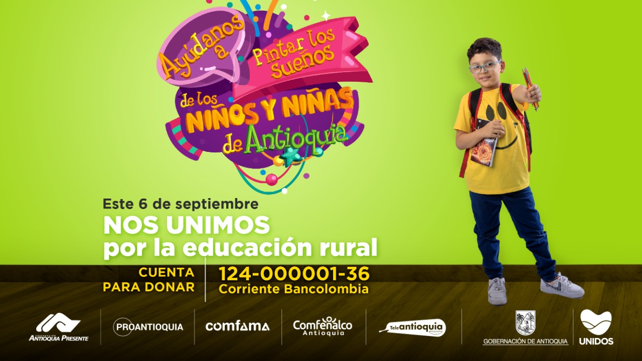 UNIDOS con Comfama, Comfenalco, Proantioquia y el canal regional Teleantioquia se impulsa la estrategia Un Día por la Educación Rural, campaña que busca movilizar a la ciudadanía, con el fin de recaudar recursos para impactar a más de 30.000 niños y niñas de preescolar de los centros educativos de los 117 municipios no certificados del departamento, con la entrega de un kit con material pedagógico apto para esta etapa del proceso formativo, y al cual muchos no tienen acceso.